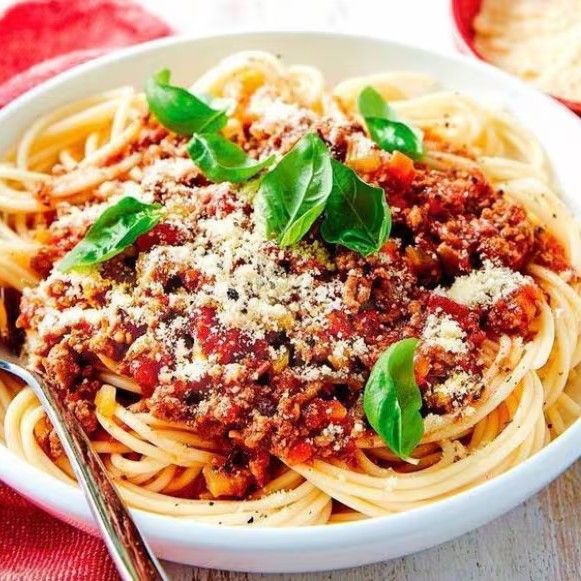 O Gemini disse Espaguete, molho bolonhesa caseiro, carne moída, tomate, cebola, alho, temperos naturais.