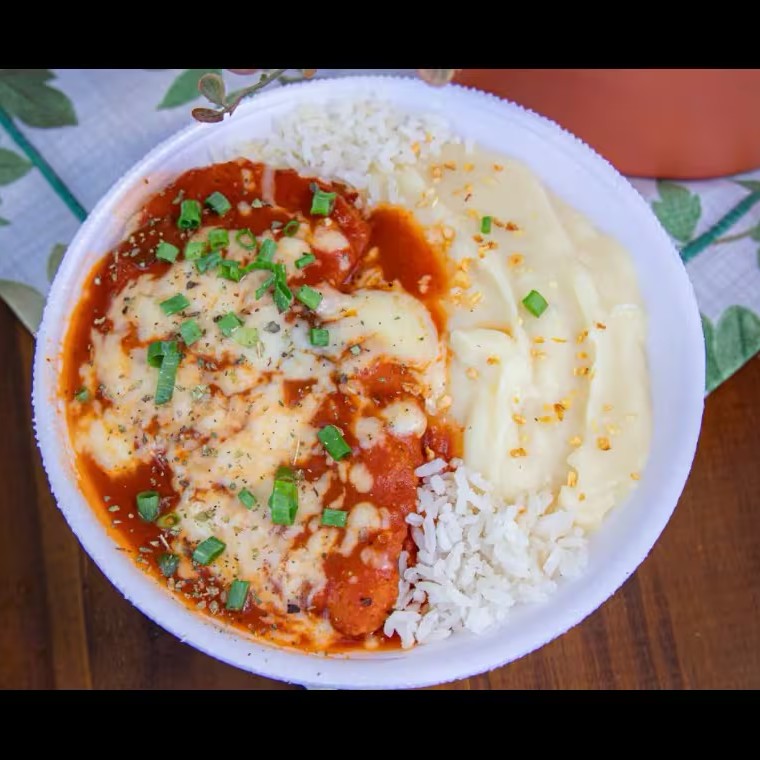 Filé de frango, massa crocante, molho de tomates, queijo mussarela, arroz branco, purê de batatas e feijão.
