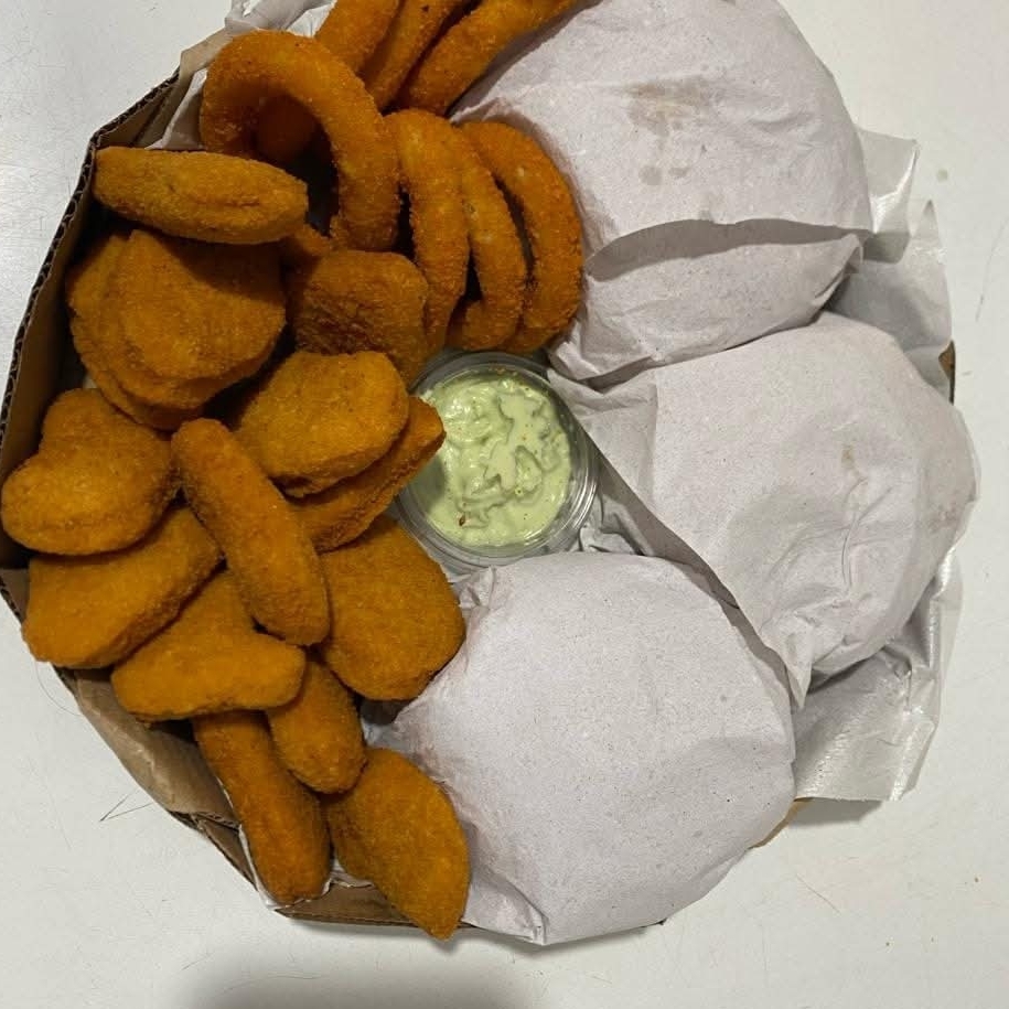 600 g de batata cheddar bacon três x-tudo uma porção de nugget uma porção de ovo codorna, 200g calabresa