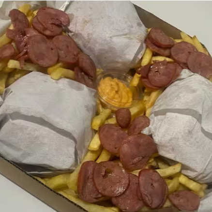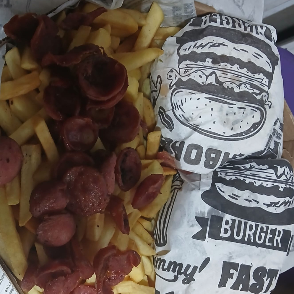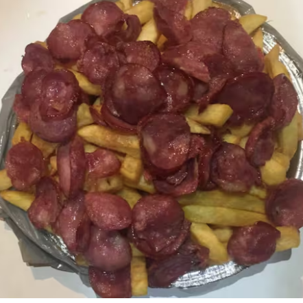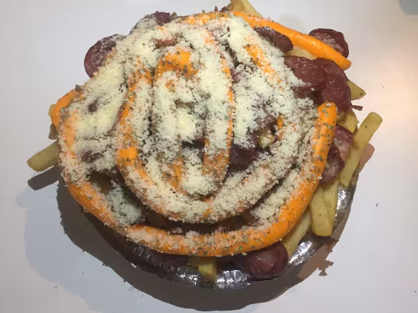 600 g de batata cheddar bacon três x-tudo uma porção de nugget uma porção de ovo codorna, 200g calabresa