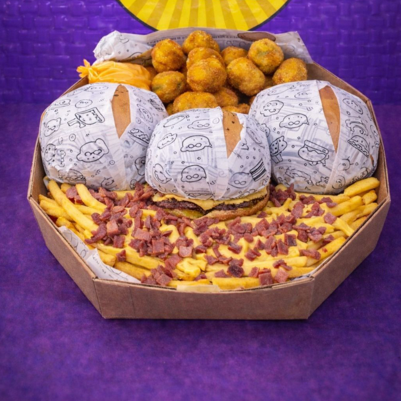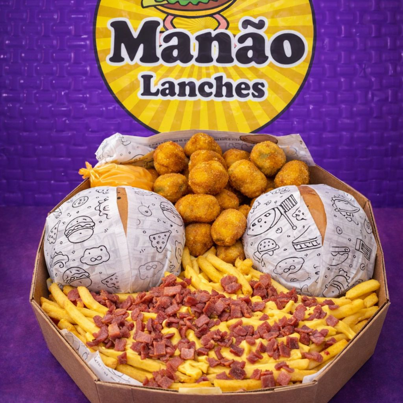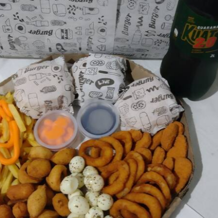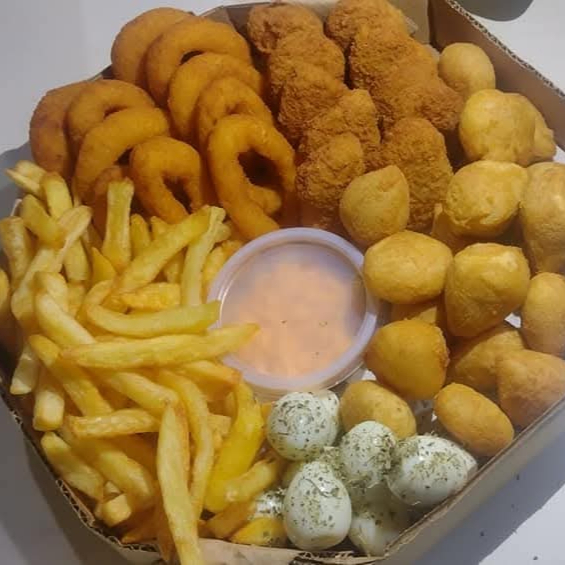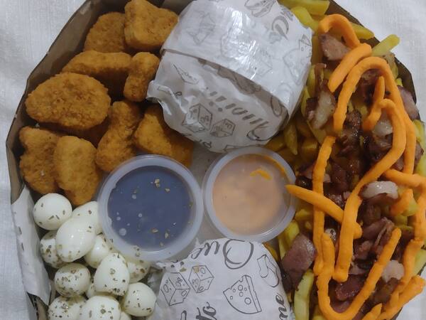 600g de batata cheddar 20 salgadinhos sete anéis de cebola sete nuggets 100 g de ovo de codorna três x-tudo acompanha um quati na ausência do mesmo sukita não substituímos por coca-cola caso queira em iti queira trocar pagar o adicional.