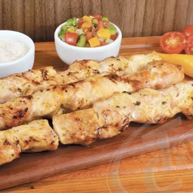 Arroz branco, Maionese,Batata frita,vinagrete, Farofa e Churrasco Filé de Frango