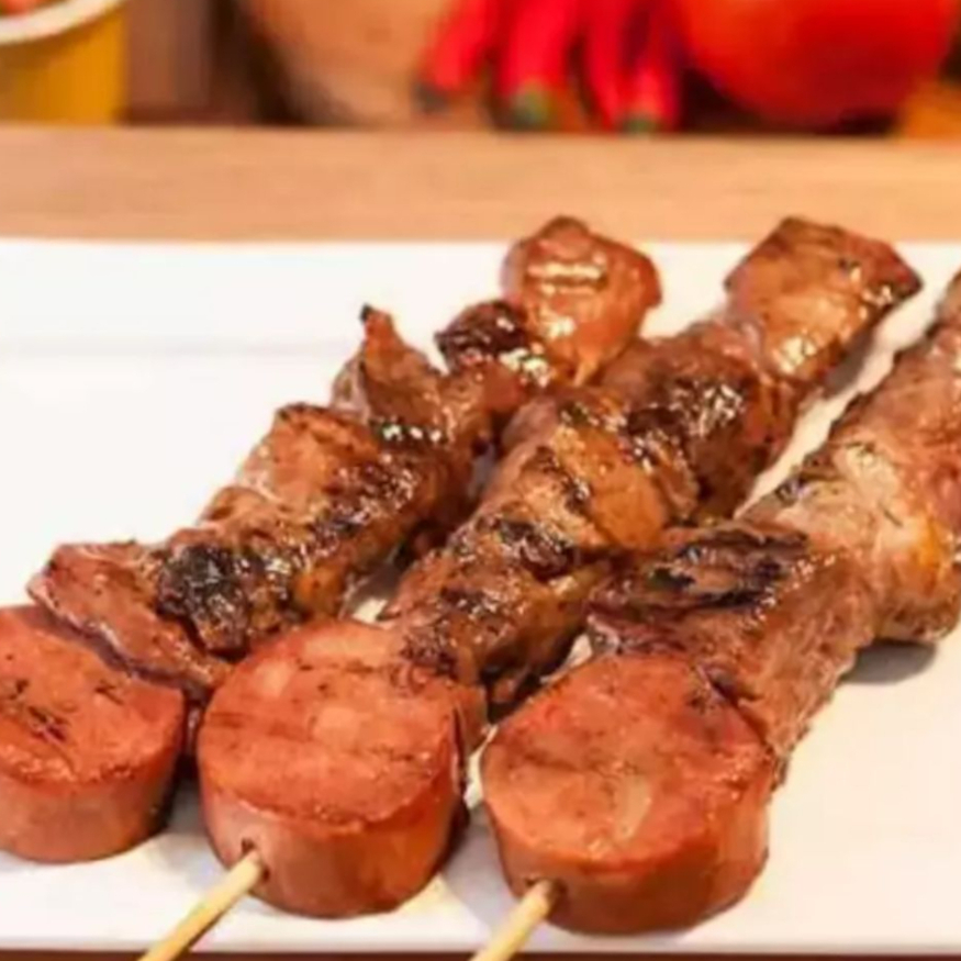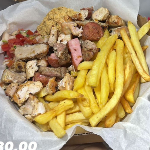 Arroz branco ,Maionese,Batata frita,vinagrete, Farofa e Churrasco Misto.