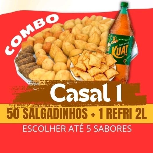 COMBO CASAL 2 • 50 SALGADINHOS/ MINI PASTÉIS. ( PODENDO ESCOLHER ATÉ 5 SABORES ), + 1 REFRI 2L. PS:. COCA, PEPSI, GUARANÁ ANTÁRTICA, SPRIT OU FANTA TEM ACRÉSCIMO