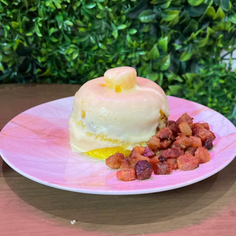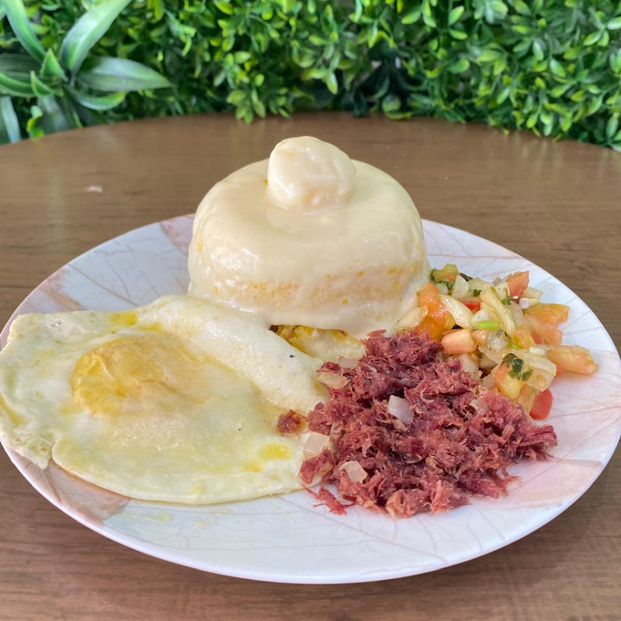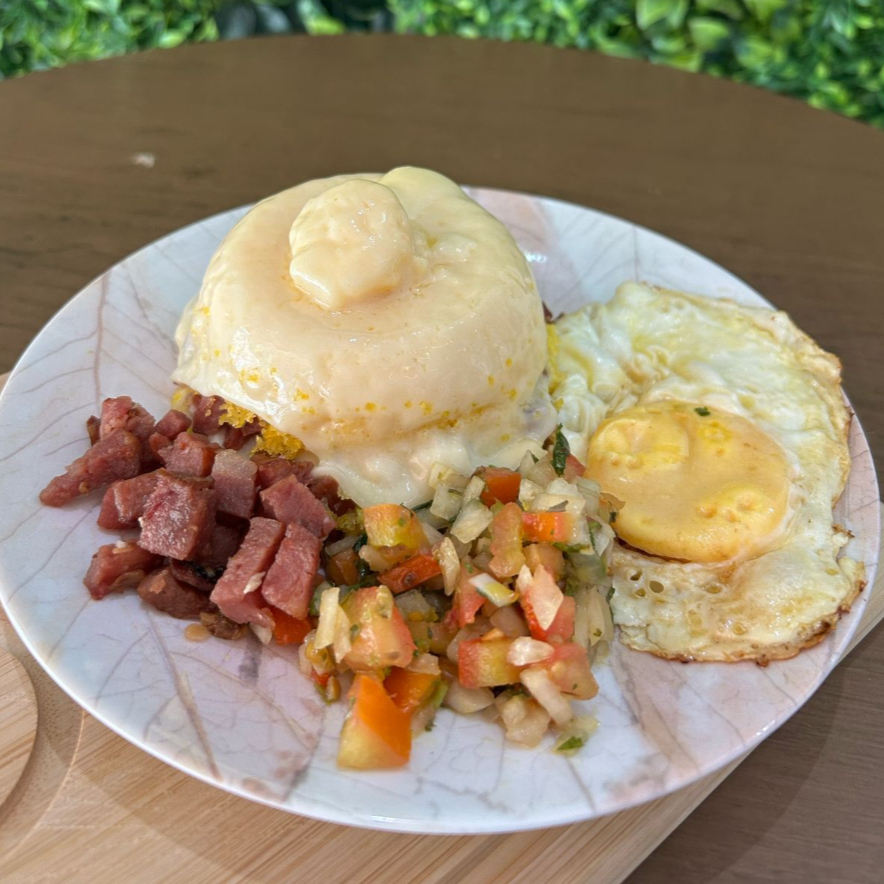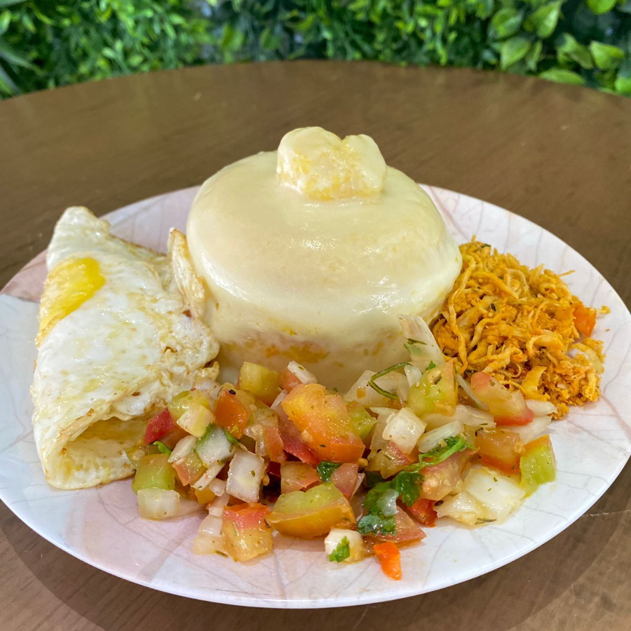 Cuscuz: recheio de sua preferência + vinagrete, ovo frito, mussarela e catupiry, Suco Laranja e docinho de brigadeiro