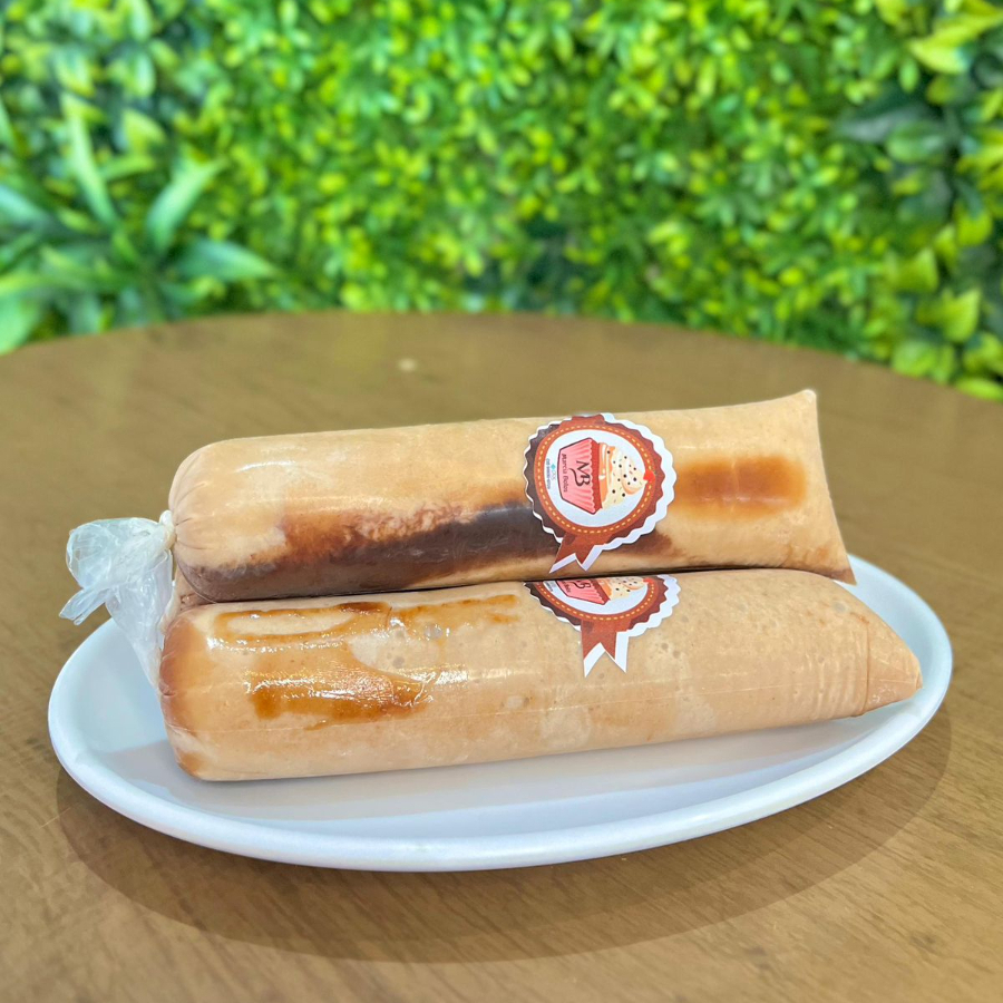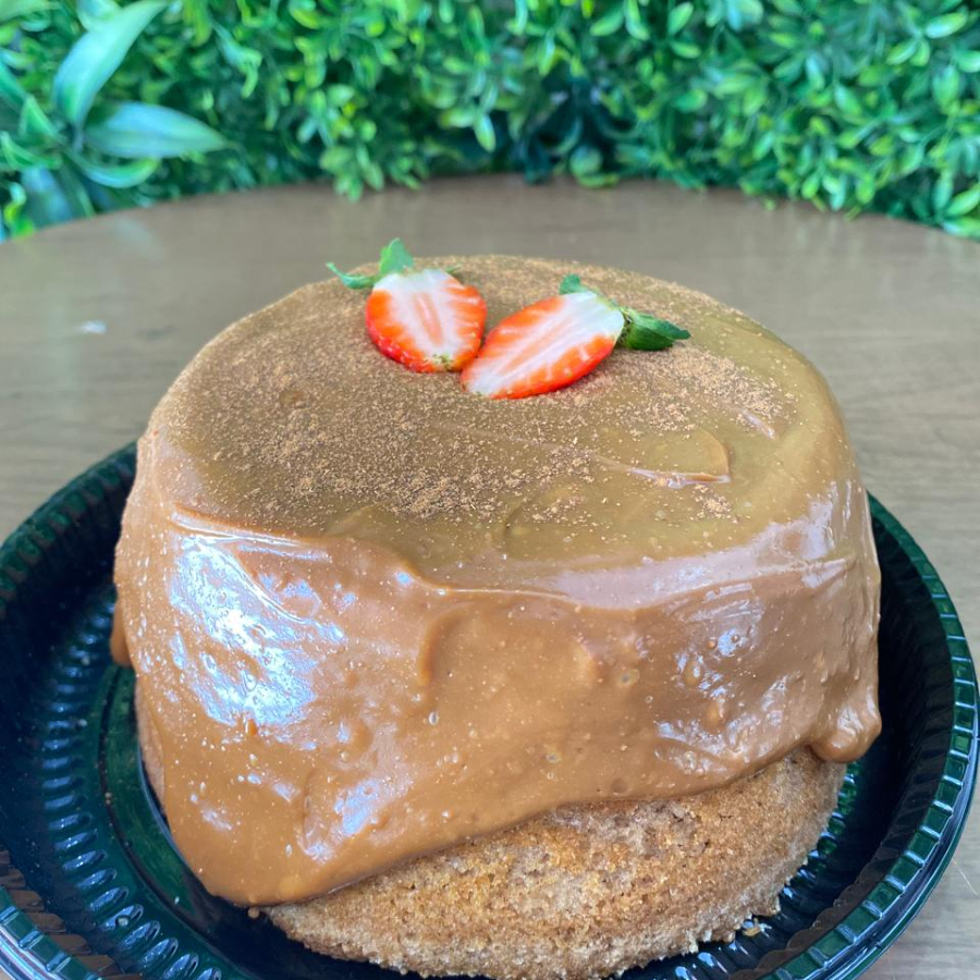 Massa branca bem molhadinha com recheio de pudim e uma camada de Doce de Leite.