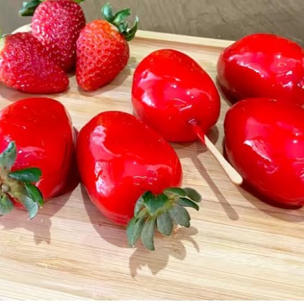 Morango inteiro com recheio de Ninho, coberto com calda caramelizada.