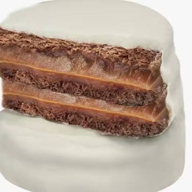 Alfajor recheado com duas camadas de doce de leite e cobertura de chocolate branco.