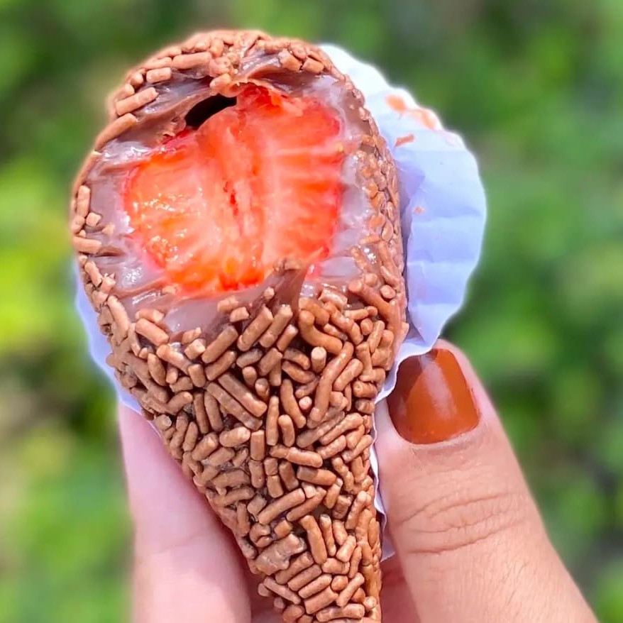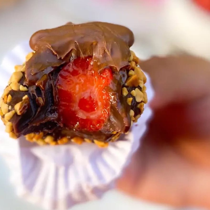Morango fresco envolvendo um apaixonante brigadeiro gourmet de Ninho, finalizado com nutella. Impossível não se apaixonar por esse doce