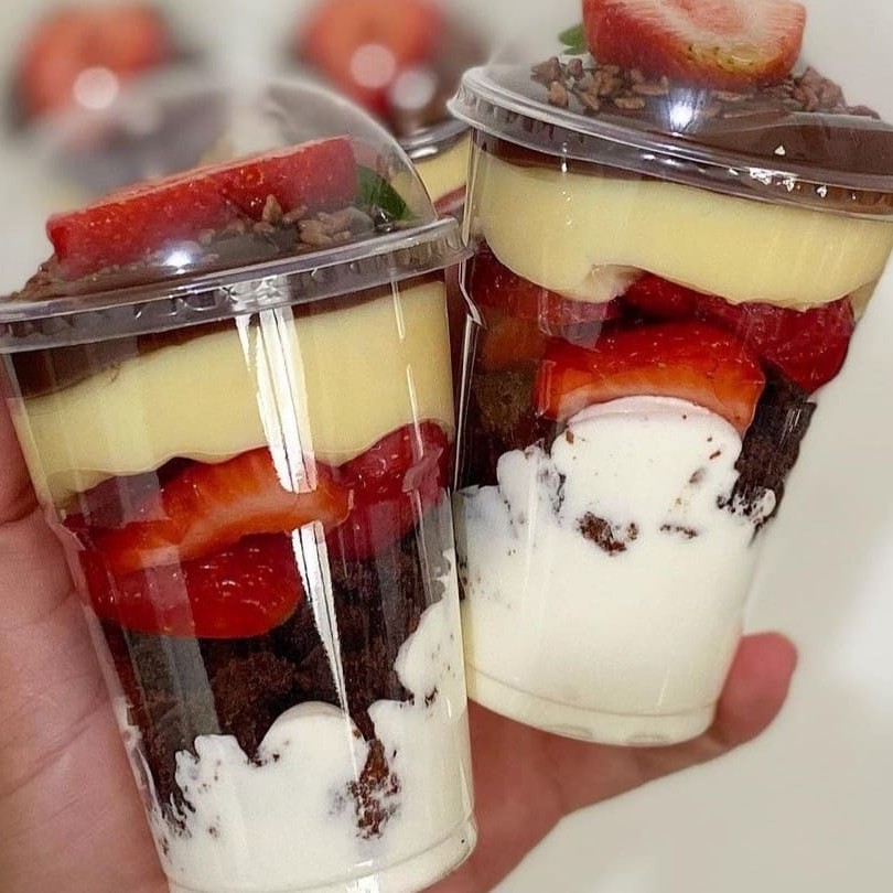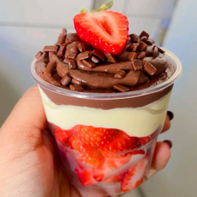 Delicioso e inigualável copo da felicidade brownie com creme de Ninho super cremoso, morangos silvestres selecionados, e o nosso creme de chocolate premium. volume 200ml