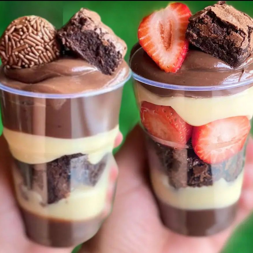 Leve 01 copo da felicidade duo brownie com morango + 01 copo duo brownie brigadeiro com desconto