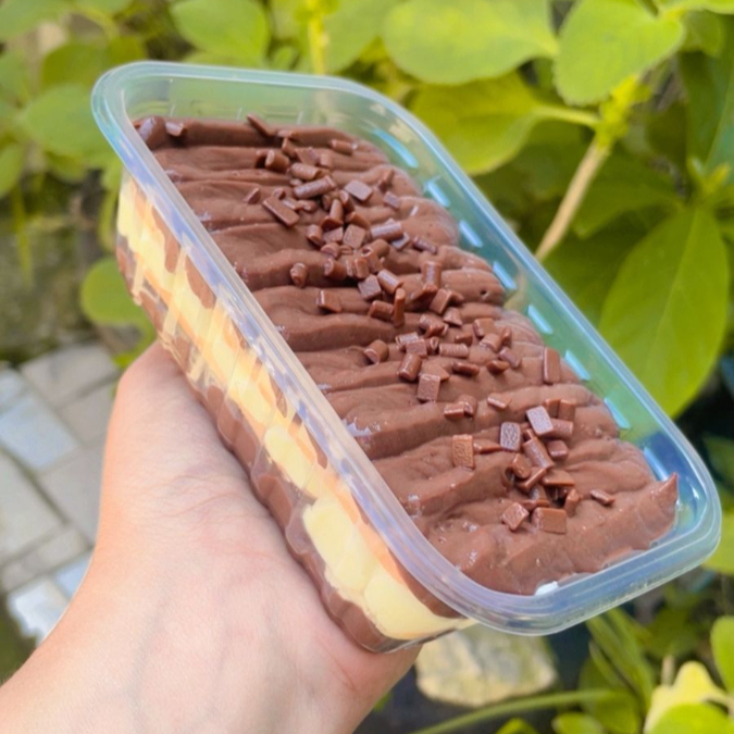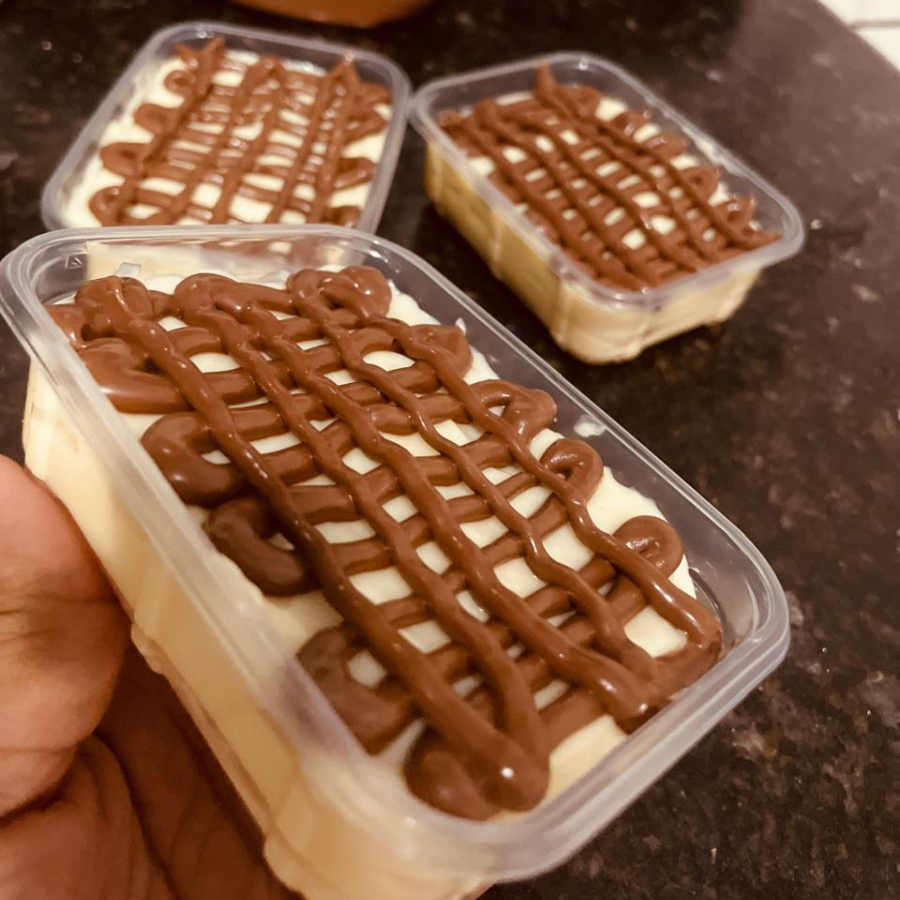 Creme de chocolate, intercalado com biscoito maisena e creme 4 leites. Embalagem de 250ml