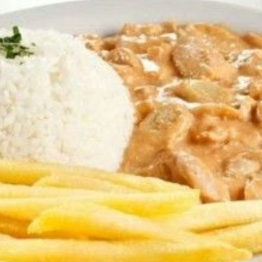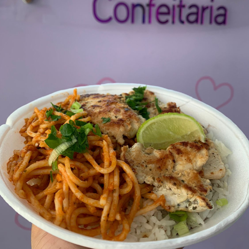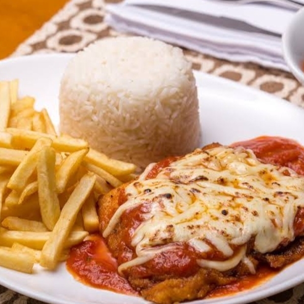 arroz branco, feijão preto, macarrão, filé de frango grelhado com salada verde ou purê de batata