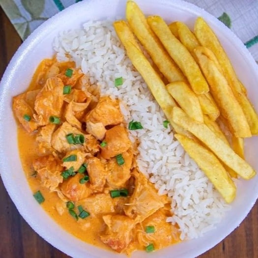Delicioso Marmita de strogonoff de frango ,Acompanha Arroz e Batata frita Aproximadamente 500g