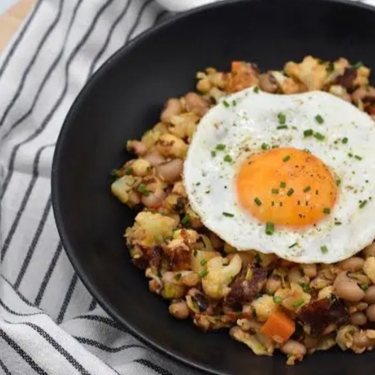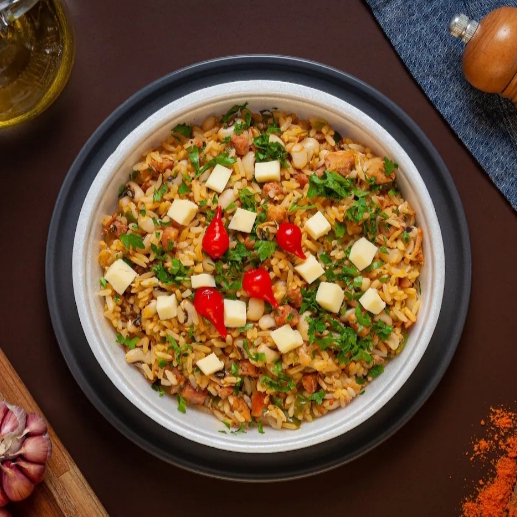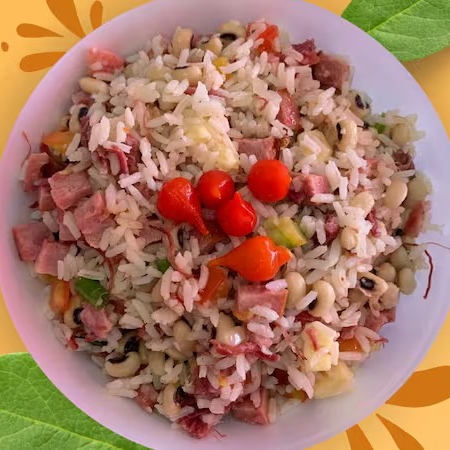 Arroz soltinho, feijão fradinho fresco com bacon e linguiça calabresa,toscana, cebola, temperos e queijo fritas e farofa