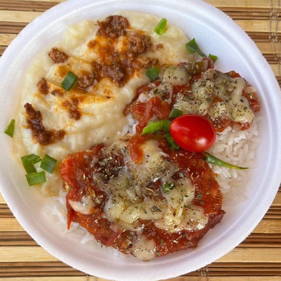 Acompanha 2 marmitex de parmegiana de frango com arroz fritas e um delicioso file de frango parmegiana coberto com molho e queijo