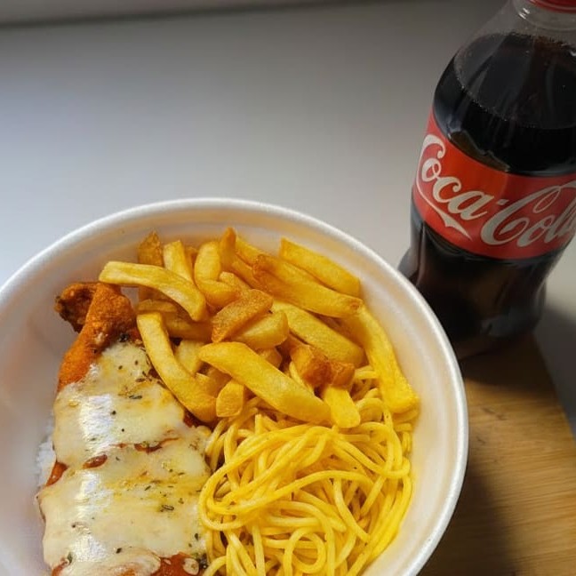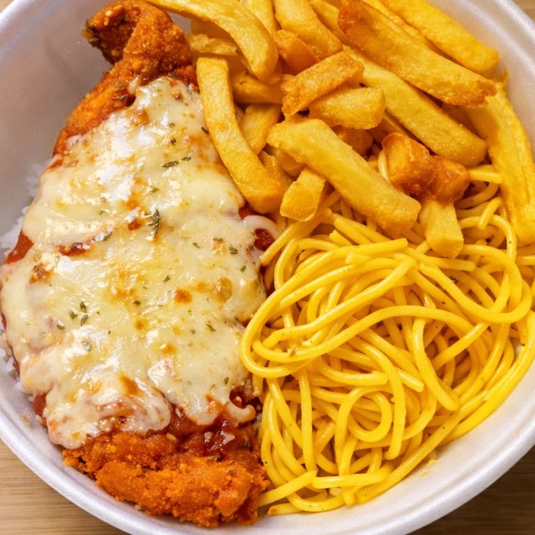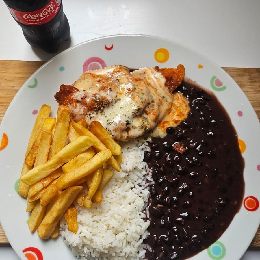 Acompanha Arroz Branco , Feijão , Macarrão , Batata Frita e Frango À parmegiana , Serve 1 Pessoa aprox ( 500g )