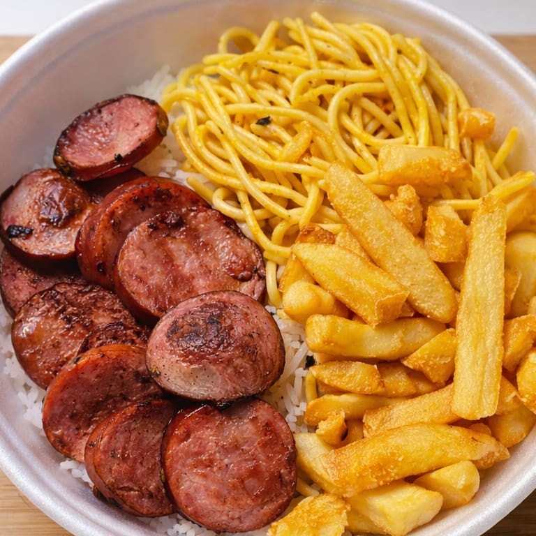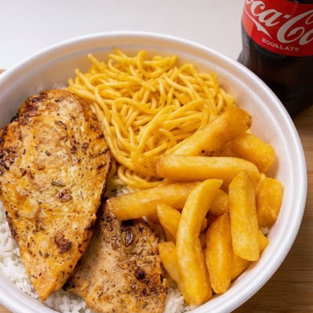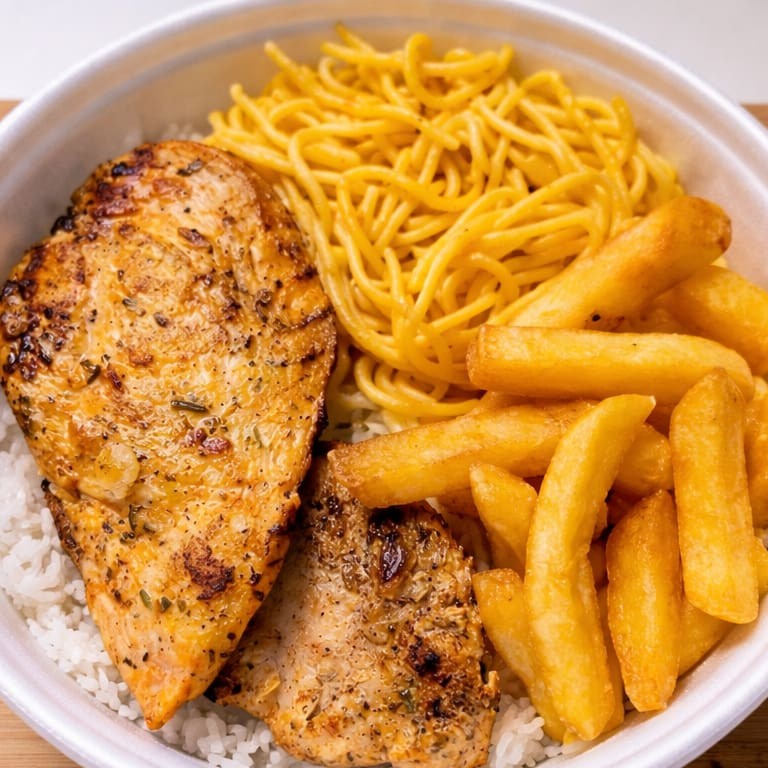 Acompanha Arroz Branco , Feijão , Macarrão , Batata Frita e Frango Grelhado , Serve 1 Pessoa aprox ( 500g )