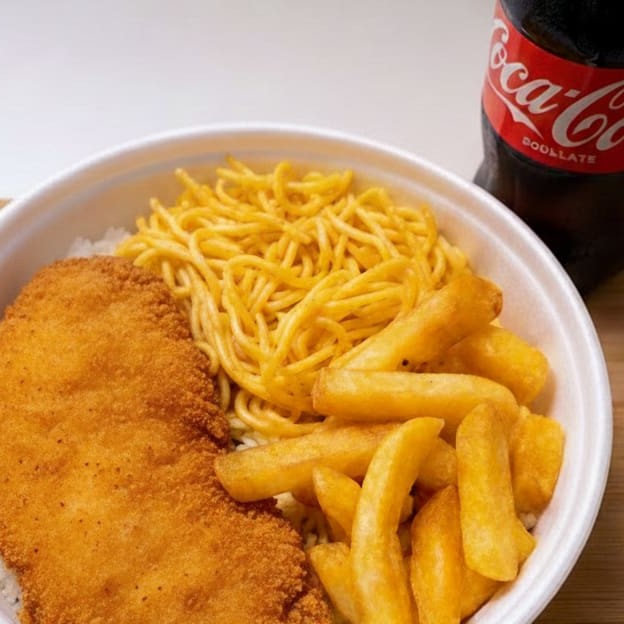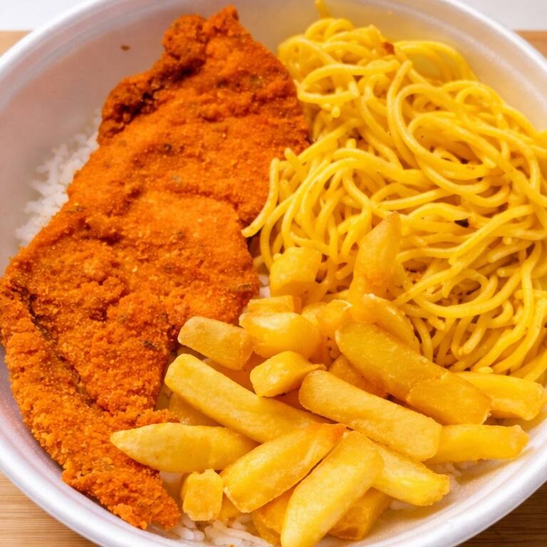 Acompanha Arroz Branco , Feijão , Macarrão , Batata Frita e Frango Empanado , Serve 1 Pessoa aprox ( 500g )