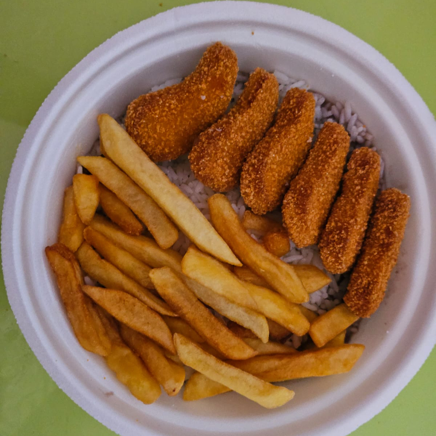 Acompanha Arroz Branco , Feijao , 6 Nuggets + Batata Frita