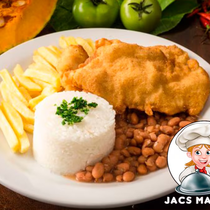 Itens: Milanesa de Frango, Feijão, Arroz Branco, Macarrão, Farofa e salada verde