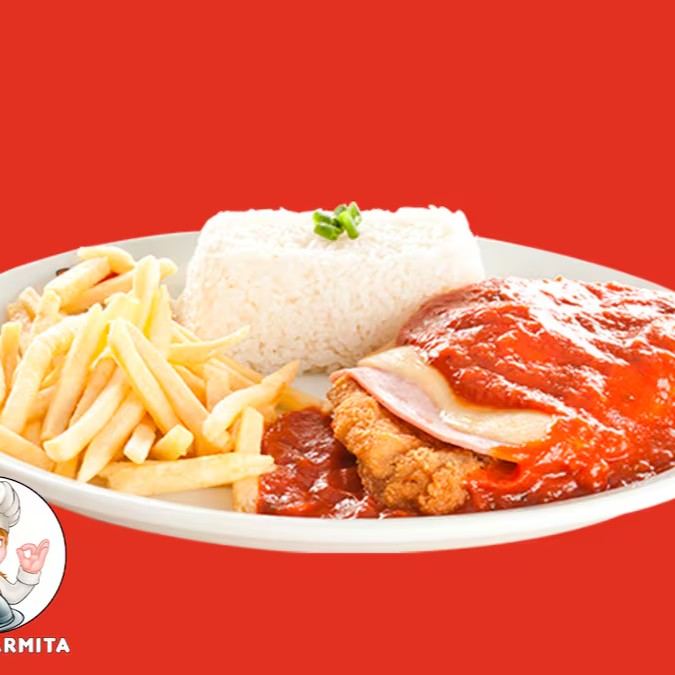 Itens: Feijão, Arroz, Frango à Parmegiana, Farofa, salada verde ou Fritas opcional