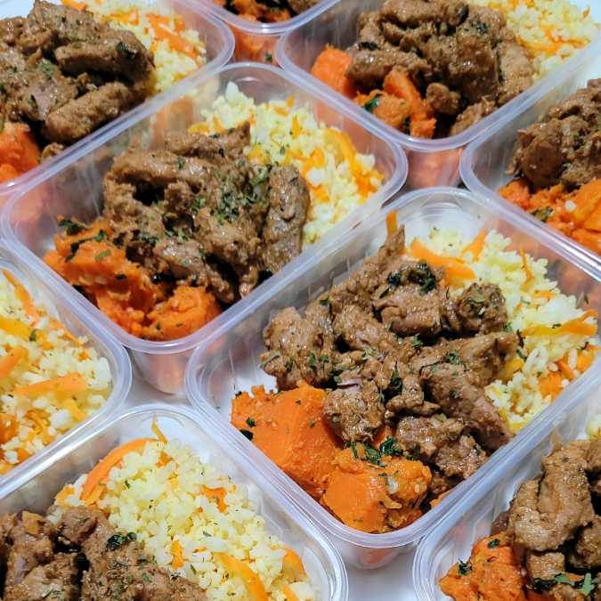 Arroz,feijao Carioca, Bife De Pernil Em Tiras , Abobora Refolgada Com Ervas Finas.430g