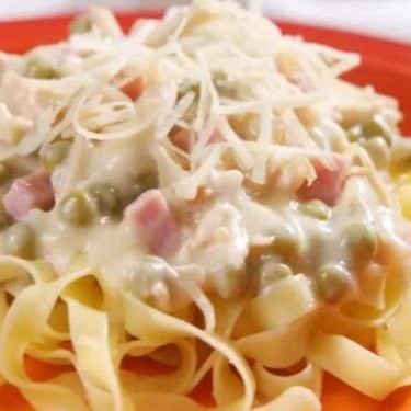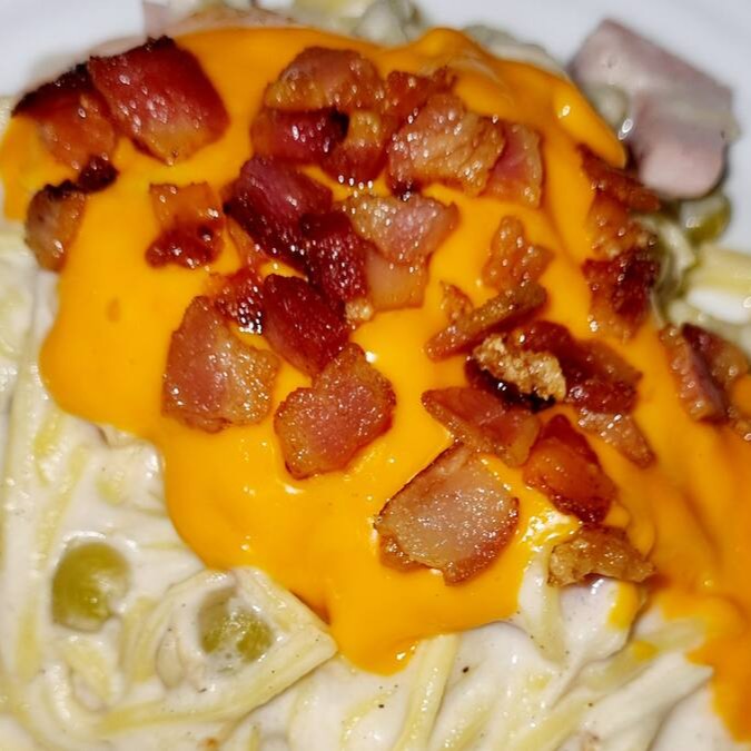 Delicioso talharim, finamente cozido com refinado molho bacharel de frango, ervilha. Sabores irresistível e paladar puro.Cobertura de cheddar derretido com delicadeza de de sabor. Crispe de Bacon para saborizar ainda mas o paladar.