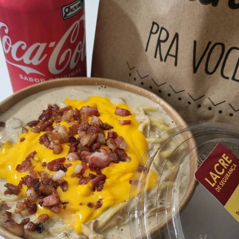 Talharim Bachanel c/ frango desfiado, ervilhas e uma deliciosa cobertura de cheder morna com crispe de bacon. Acompanhado de uma Coca Cola de 395g. Gelada para suas refeições.