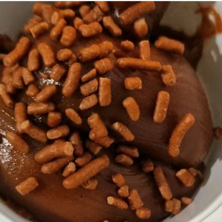 Delicioso Brigadeiro feito com chocolate em barra e pó. Leve condensado delicamente mexidos no ponto de saborear uma delicadeza a boca. Cobertura de granulado a quantidade ideal.