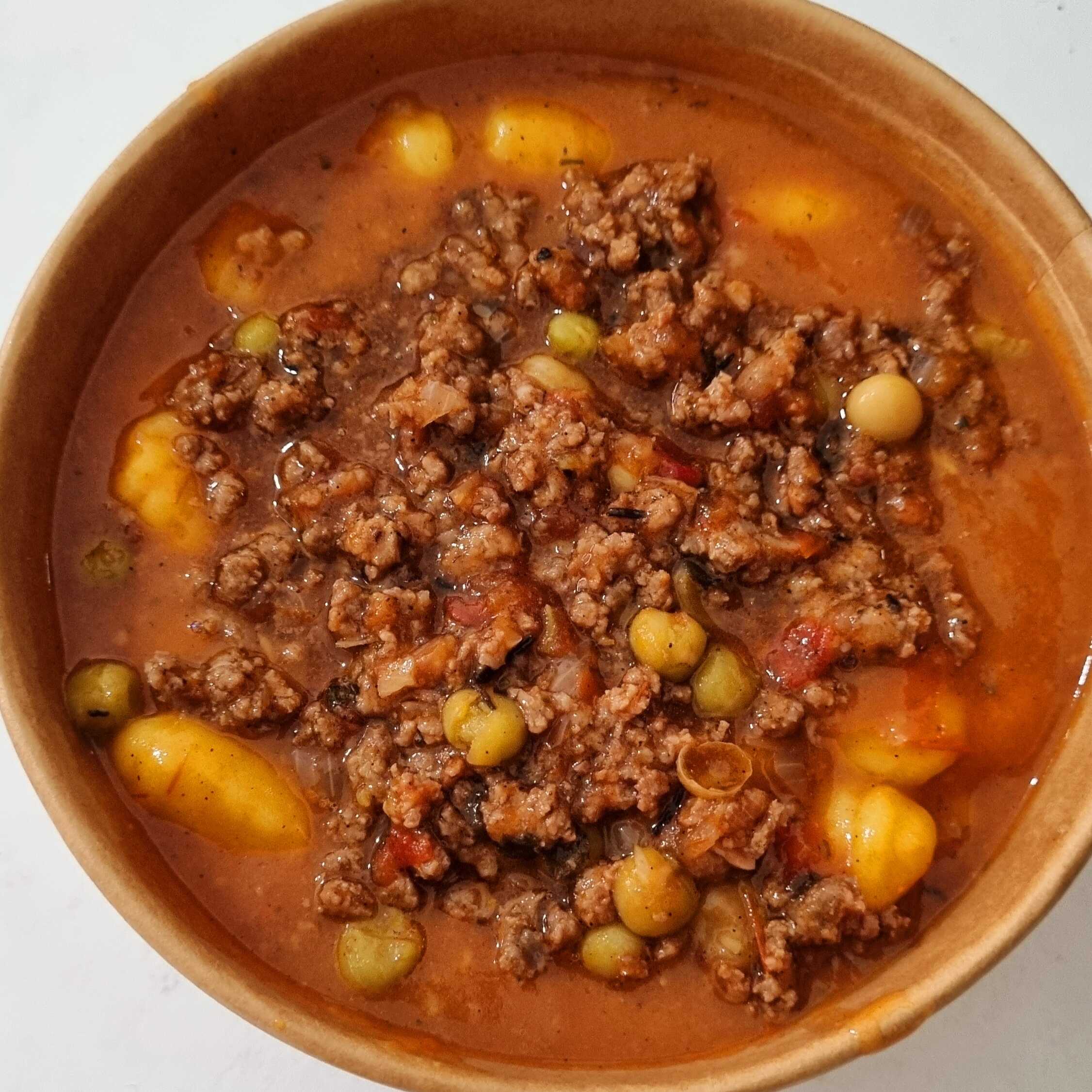 Inhoque com 500k. Sabor bolonhesa com molho de tomate encorpados com carne moída bem temperada. Com ervilha, acompanhando delicioso queijo ralado. Para sobremesa Brigadeiro de chocolate com granulado.