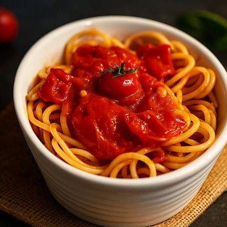 Massa espaguete ao molho sugo. Preparado com tomates maduros e suculento, este molho é cozido lentamente para realçar sua doçura natural e cria uma textura rica e aveludada.