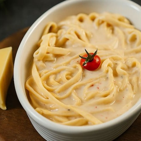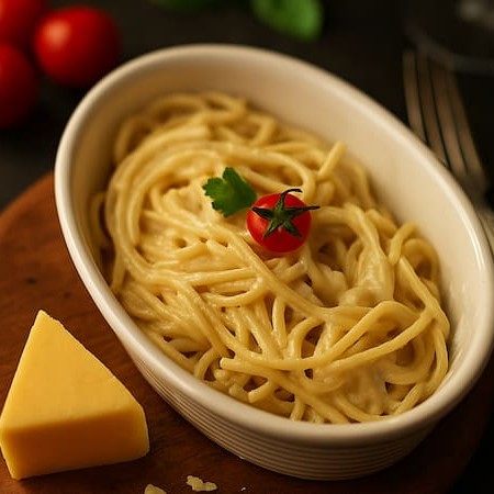 Massa espaguete com molho artesanal cremoso bechamel, feito com manteiga, leite e toque de noz-moscada. Finalizado com tomate cereja e salsinha ou manjericão.