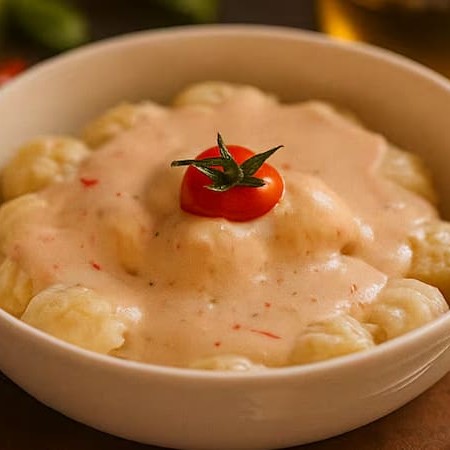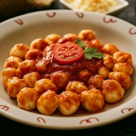 Nhoque de batata ao molho sugo. Preparado com tomates maduros e suculento, este molho é cozido lentamente para realçar sua doçura natural e cria uma textura rica e aveludada.