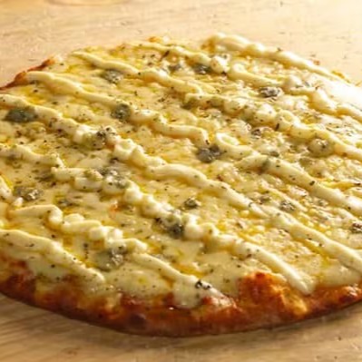 Molho de tomate, mussarela, parmesão, Catupiry, gorgonzola e orégano.