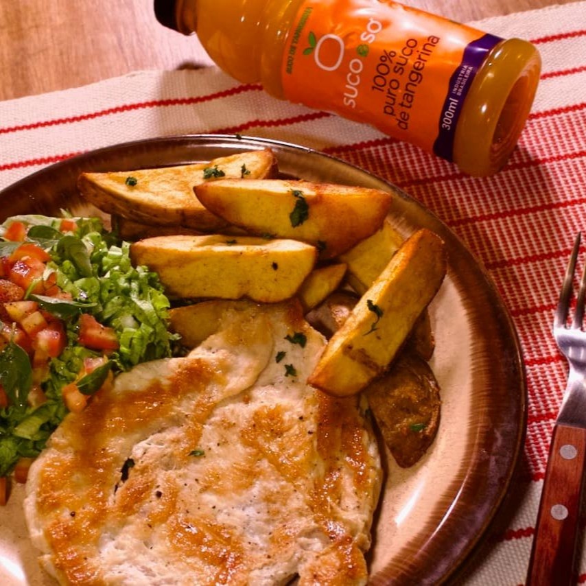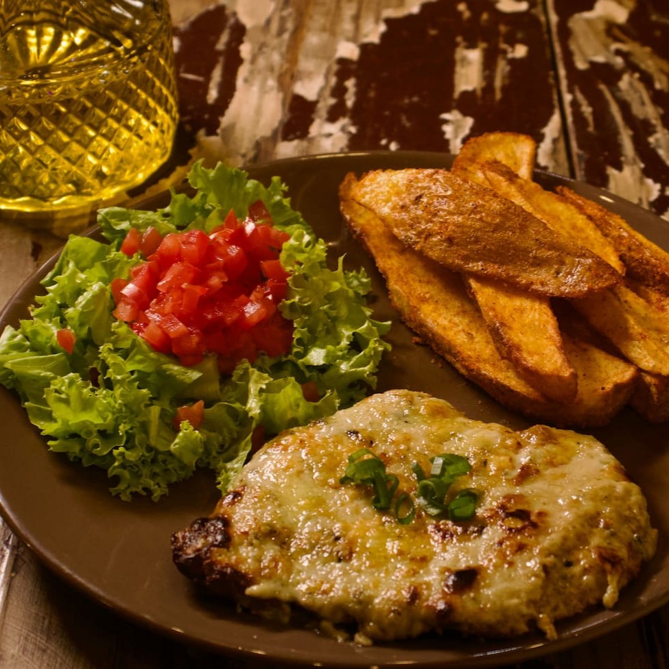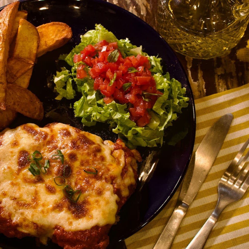 Delicioso Bife Á Parmegiana feito com o Miolo da Alcatra no Molho de Tomate Italiano Especial do Cheff com Mussarela Premium Gratinada no forno. Acompanha: Porção de Batata Rústica Temperada com Páprica Defumada E Salada Especial da Casa com Alface Crespo, Pequenos Pedaços de Tomate Italiano finalizada com um toque de Azeite Premium e Manjericão Fresco.
