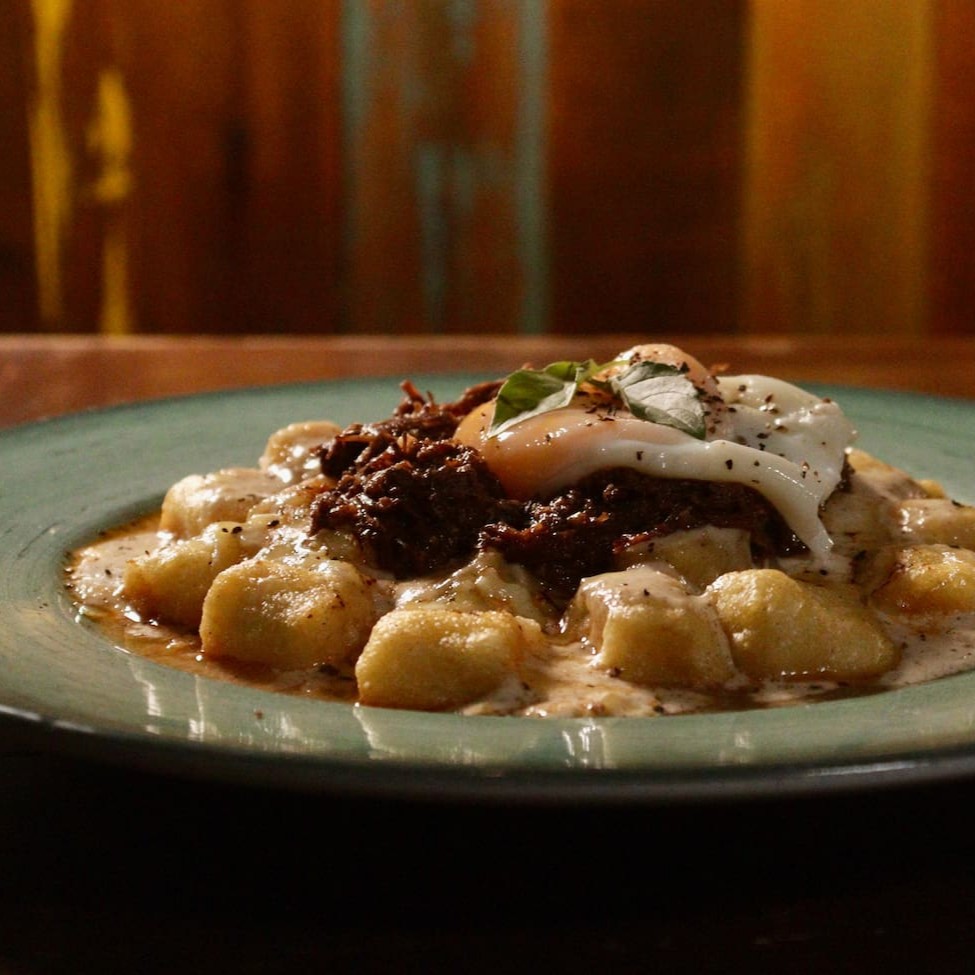 Nhoque Frito, Molho Alfredo De Parmesão Ragu De Costela Finalizado Com Ovo Poché