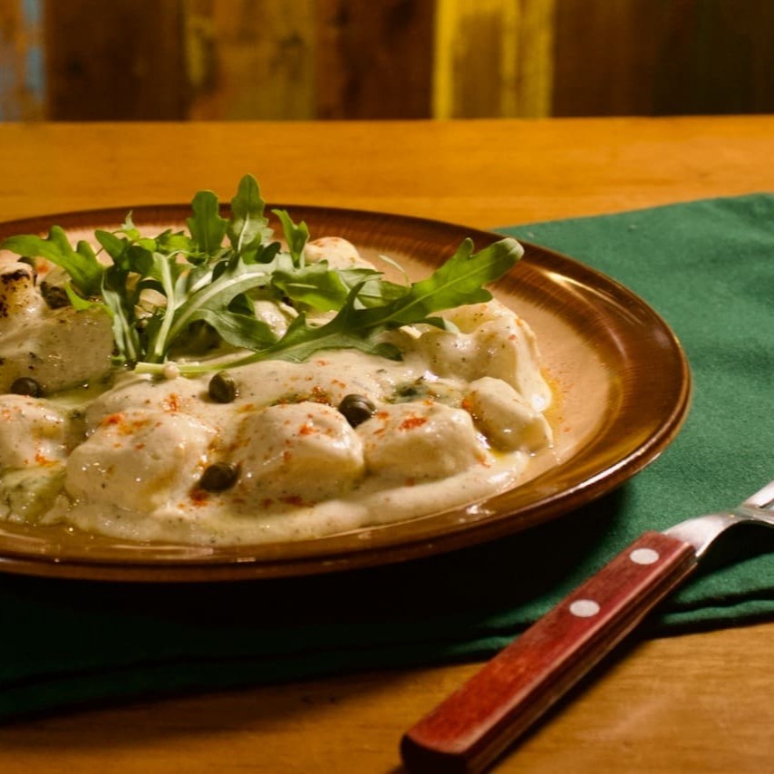 Nhoque Artesanal Feito pelo Nosso Chef com a Famosa Batata Asterix com Delicioso Molho de Gorgonzola toques de Alcaparras e Finalizado com Rúcula Fresca, receita da casa!