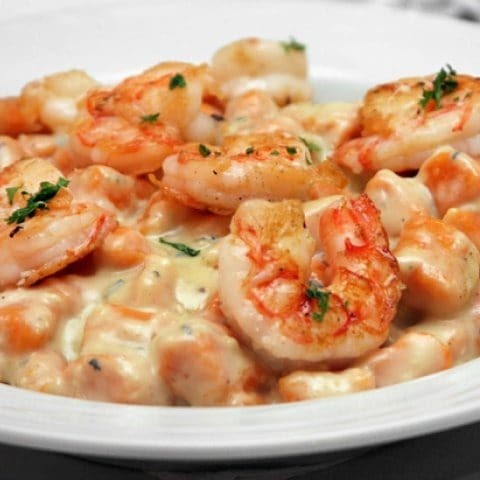 Nhoque De Batata Doce Salmão Com Camarão, Molho De Gorgonzola E Bacon Crocante