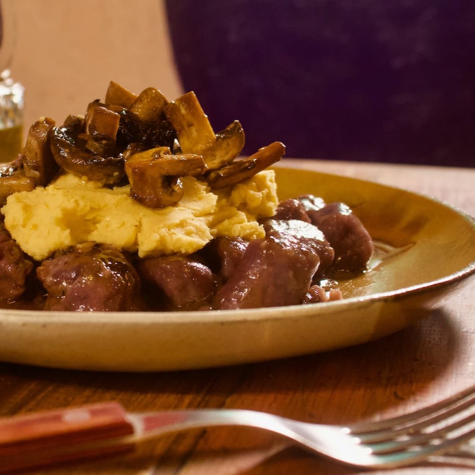 Nhoque De Batata Doce Roxa (sem Glúten) Com Cogumelos Defumados (vegano)