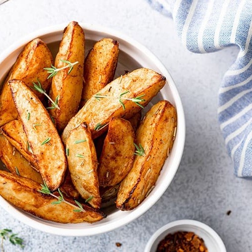 Porção de Batata Rústica com Ervas Finas finalizada com Páprica Defumada.