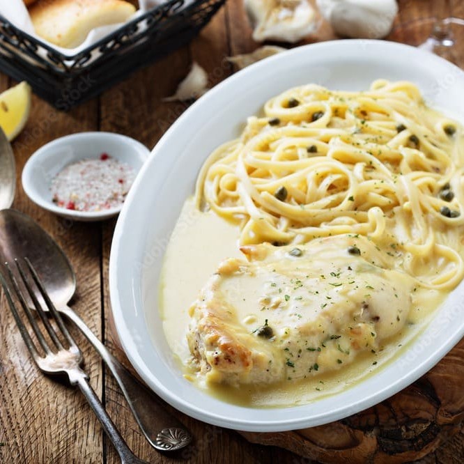 A Picatta de Frango é um prato ítalo-americano, isto é, nascido da mistura da gastronomia americana com a italiana. Muito saborosa Empanado na Farinha de Arroz, feito no creme de leite fresco com alcaparras, e toque de limão! Finalizado com cebolinha! Você tem a opção de escolher Sem Glúten ou com Espaguete!