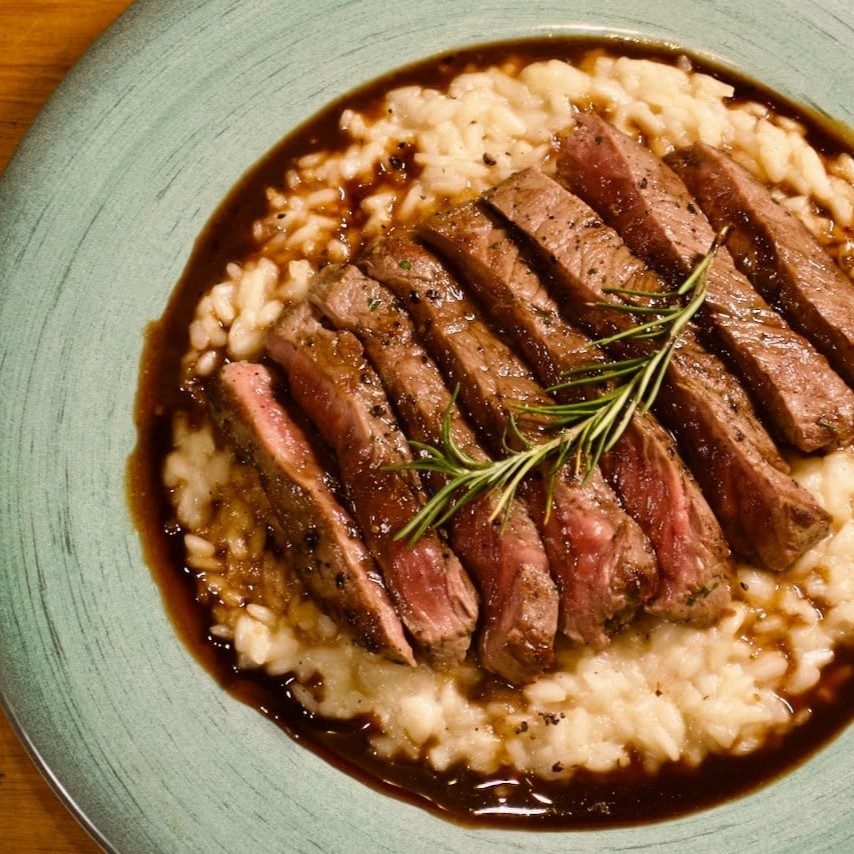 Risotto Cremoso com bifes que são cuidadosamente feitos, cortados e delicadamente dispostos sobre nosso risotto. Feito na manteiga de ervas, que adiciona um aroma irresistível . Redução de melado de cana, elevando ainda mais a experiência gastronômica.