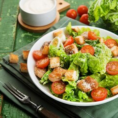 Filé de Frango cortado em tiras, Tomate Cereja, Queijo Feta, Vinagre Italiano Balsamic, Rúcula Selvagem e Alface Crespa finalizada com Molho Caesar. Salada ao Pollo