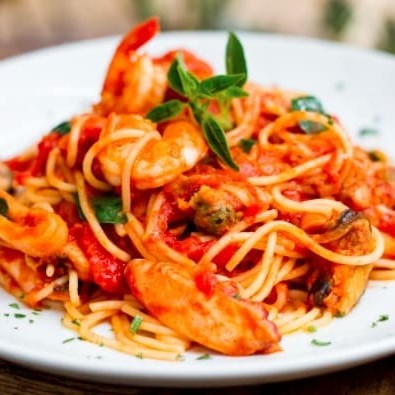 Espaguete ao molho sugo, com camarão, mexilhão, kani e lula. Finalizado com Mussarela.