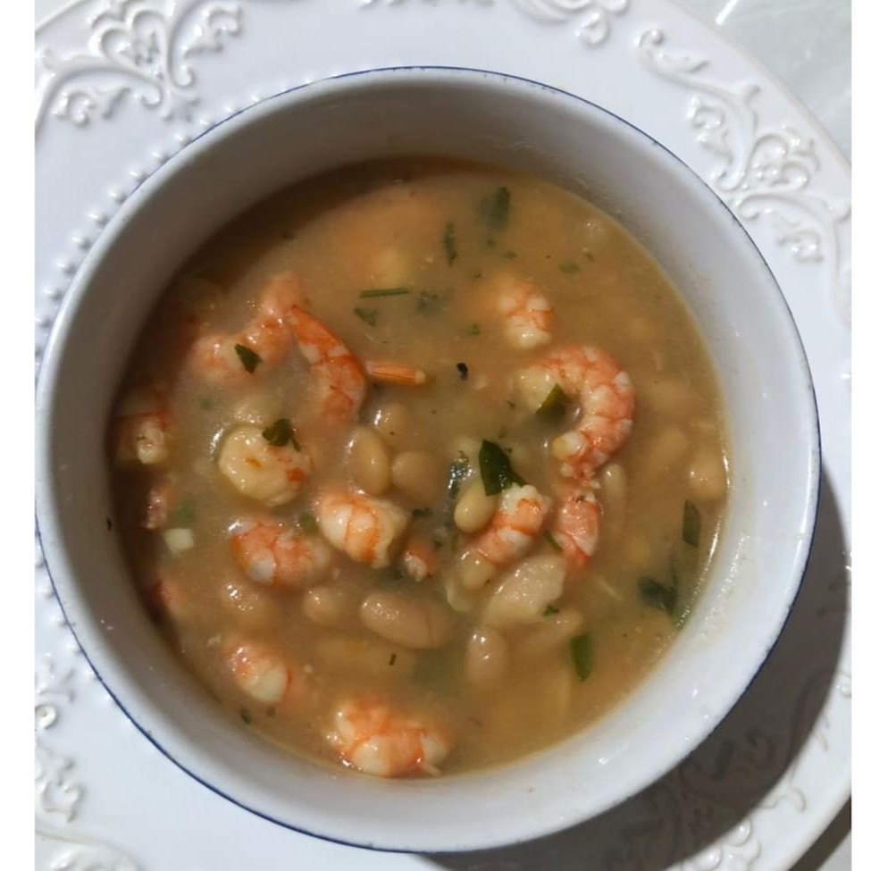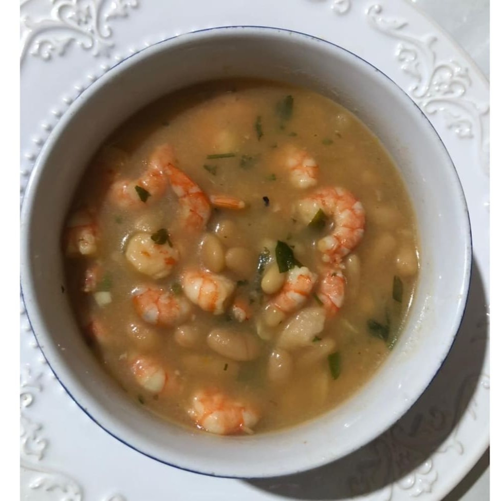 Feijão branco, camarão e o tempero da Tia Rose. Acompanha torrada.