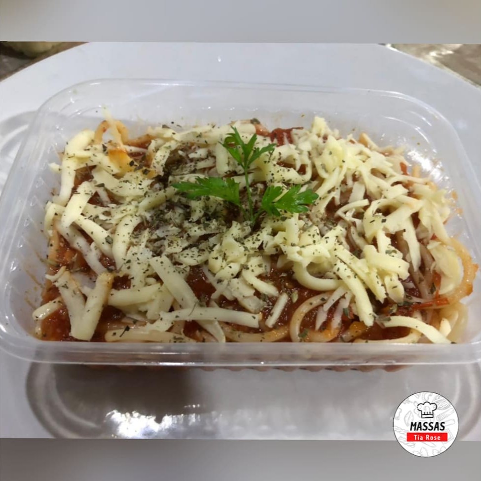 Uma deliciosa lasanha caseira, molho a bolonhesa e mussarela ralada.