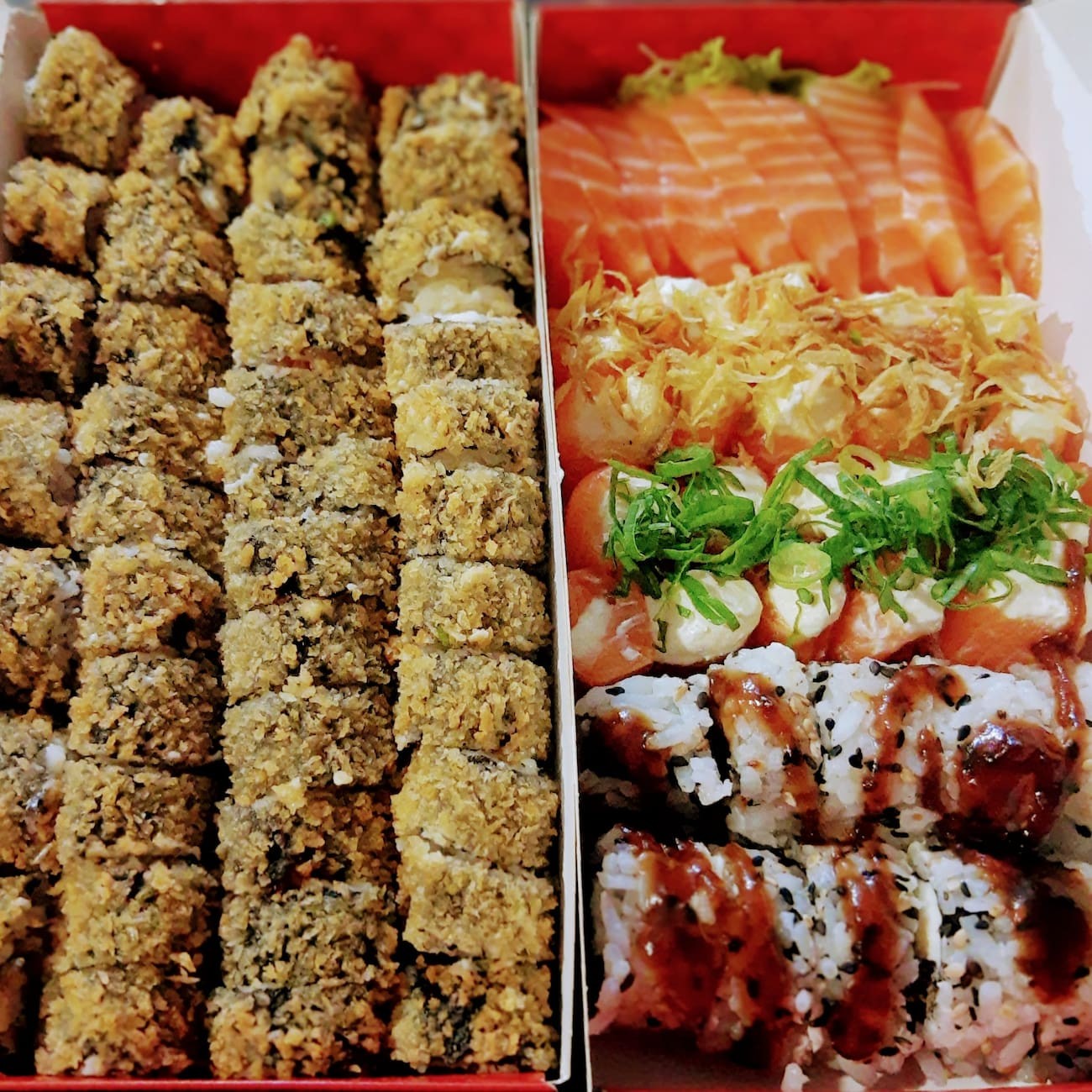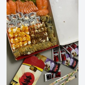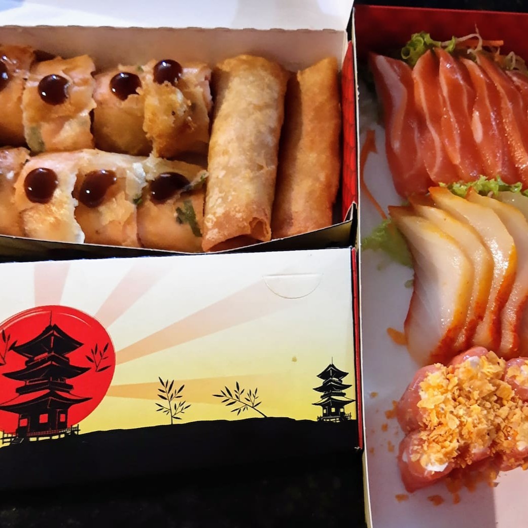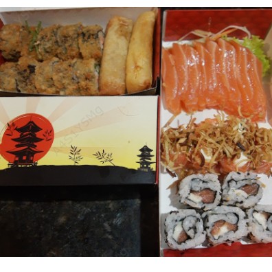 10 sashimi salmão, 20 jholl poró, 20 jholl Doritos, 20 hot filadelfia, 10 filadelfia maki, 5 sushi de salmão e gratis 2 harumaki de chocolate ao leite.