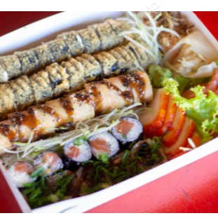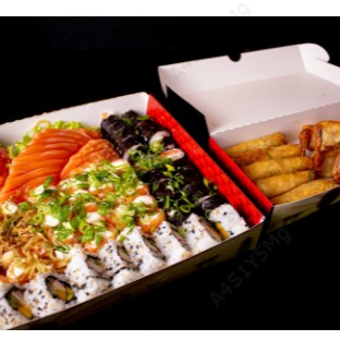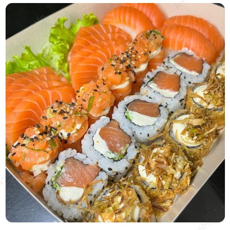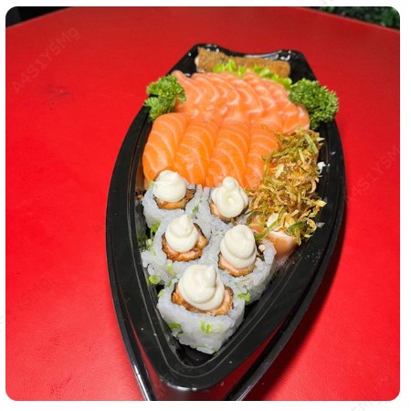 30 pçs sashimi salmão, 20pçs jholl poró, 20pçs jholl cebolinha, 20 pçs filadelfia, 5 harumaki frango e 5 eby escorpião.