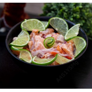 Cubos de peixe temperado e marinado no limão, cebola roxa e pimentão colorido.